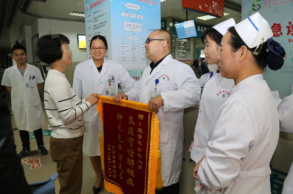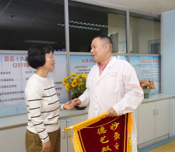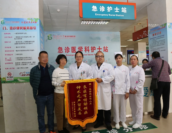 11月14日,一名患者在家属的陪同下,来到了南方医科大学第五附属医院心血管内科二区和急诊科,分别将印着“妙灸神针医百病,德艺双馨传四方”,“良医有情解顽疾,神术无声留美名”的两面锦旗,送到医护人员手中,表达对医护人员的感激之情。