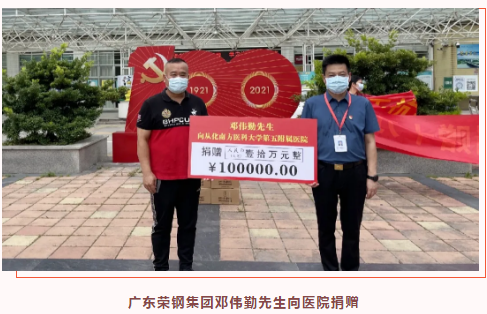 广东荣钢集团邓伟勤先生慷慨解囊,向南医五院捐助10万元。他说,抗疫期间,南医五院广大医务工作者白衣执甲、逆向而行,冒着高温酷暑为市民做核酸检测、疫苗接种等,看着他们衣服被汗水湿透、双手被汗水浸泡得皱皮,却仍然加班加点为市民服务,内心深受感动,希望为抗击疫情贡献一份力量,向奋战在一线的医务人员表示衷心的感谢和崇高的敬意!