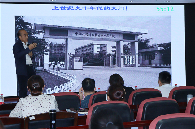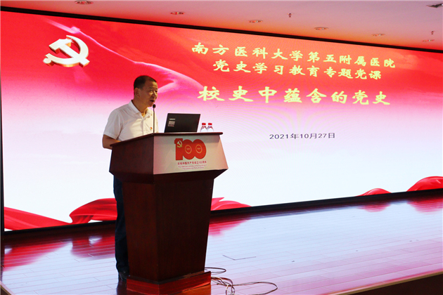 10月27日下午,在南方医科大学建校70周年之际,南医五院党委组织党史学习教育专题党课,学习校史中蕴含的党史,大学通识教育部主任严金海教授讲授了一堂精彩的党史和传奇的校史课。全院各党支部书记,部门、科室相关负责人及骨干参加学习。