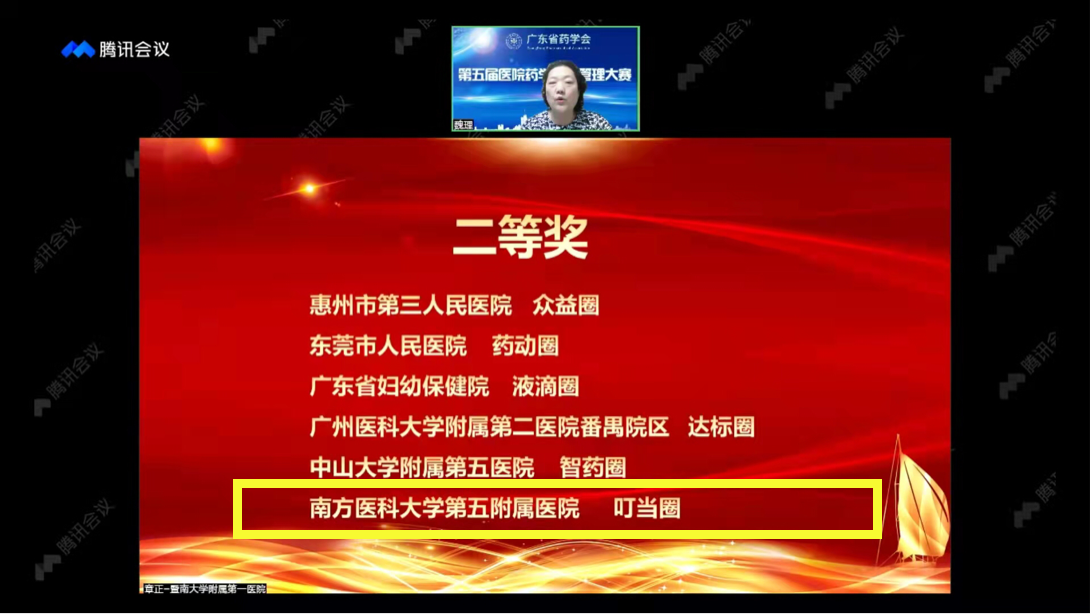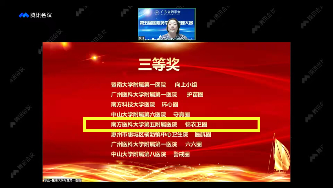 各参赛队伍情绪饱满、激情洋溢,整个过程亮点频现、精彩纷呈。经过激烈的角逐,南医五院药剂科在第五届广东省药学会医院药学品质管理大赛中再创佳绩。其中,“叮当圈”,旨在降低抗菌药物使用强度,促进临床合理使用抗菌药物,获第五届医院药学品质管理大赛二等奖。“锦衣卫圈”,改善主题为提高住院患者注射用质子泵抑制剂合理使用率,获第五届医院药学品质管理大赛三等奖。本次参赛的2个品管圈曾在南医五院“2020品管圈评比大赛”中荣获奖项。