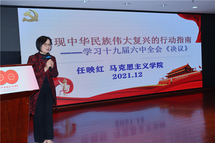 任映红院长围绕《实现中华民族伟大复兴的行动指南——学习十九届六中全会(决议)》的主题作专题辅导,她从《决议》的时代背景、主要内容、特点意义三大方面进行深入阐释和分析。她认为,《决议》是开启新征程的需要;是确保全党步调一致向前进的需要;是推进党的自我革命的需要。《决议》重点总结新时代党和国家事业取得的历史性成就、发生的历史性变革和积累的新鲜经验,是推动全党增长智慧、增进团结、增加信心、增强斗志,实现中华民族伟大复兴的行动指南。任院长最后强调,我们要善于洞察历史规律、掌握历史主动、汲取前行力量,做到勿忘昨天的苦难辉煌,无愧今天的使命担当,不负明天的伟大梦想。