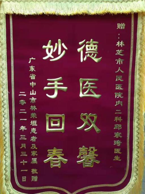 阳春三月,林芝桃花盛开,广东省中山市的一位游客林先生自驾游西藏。3月26日在昌都市八宿县,林生出现晕厥,吸氧后神志恢复,未予重视,继续驱车前行。3月27日到了林芝市波密县,林先生出现神志不清,全身紫绀,伴有右侧肢体无力、失语,在当地医院吸氧、输液后症状无好转,当地医院马上转林芝市人民医院就诊,入院时测血氧饱和度仅64%,查CT示;双肺水肿,左侧基底节脑梗死,脑水肿。被收住院后即予气管插管,接呼吸机辅助通气,并予激素抗炎、脱水、平喘、预防感染、抗血小板、调脂、改善循环、开放侧支循环等治疗。因抢救及时,3天后复查CT示肺部渗出明显减少,头颅CT未见明显脑水肿,予脱机拔除气管插管,并予床边康复治疗,林先生症状明显好转,于4月4日出院,转回中山市继续康复治疗。目前患者无明显后遗症,已经重返工作岗位。家属为表示感谢,特意从广东寄来一面锦旗。