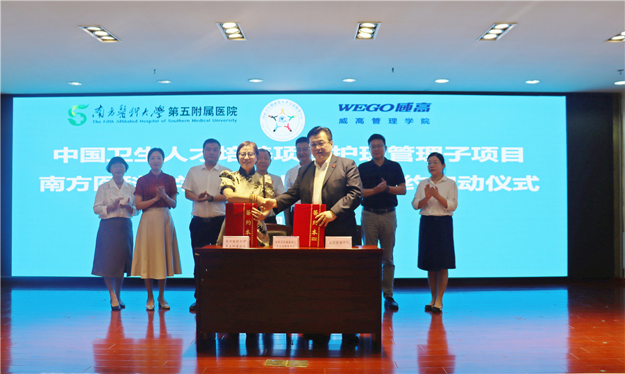 为积极落实和推进护理管理人才培养制度和机制创新,培养适合现代医院管理的护理人才,9月22日,南医五院与国家卫生健康委人才交流服务中心、威高管理学院三方共同签署了“中国卫生人才培养项目护理管理子项目”三方协议,正式开展护理管理系列培训,内容包含“情境领导”等18门课程。党委书记李绍波、副院长徐晓武,威高管理学院院长王充等相关领导出席,全院护理骨干70余人参加培训。