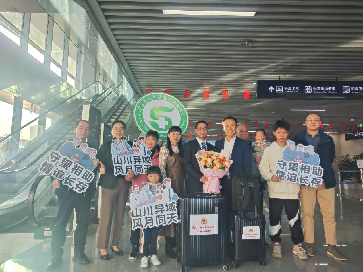 11月19日下午,医院第六批援多米尼克中国医疗队员骆志鹏与医疗队集合出发。副院长曾方银带队,骆志鹏家属、人事科及心血管内一科同事等前往广州琶洲港澳客运口岸欢送骆志鹏。