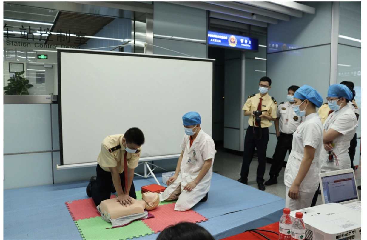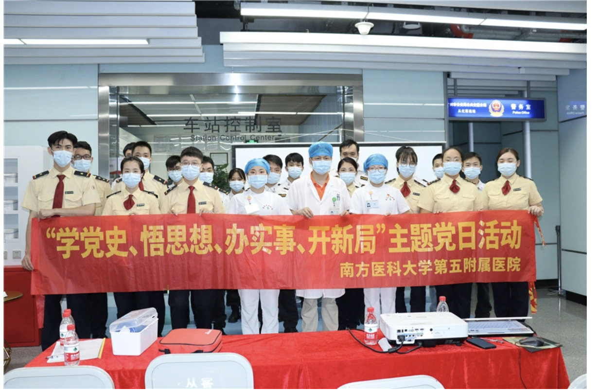 为持续深化党史学习教育,进一步推进“我为群众办实事”实践活动,7月30日上午,南医五院联合广州地铁集团十四号线从化客运站中心站开展“站医零距离,护航生命安全”共建活动,进一步强化安全意识,普及急救常识,传播“人人学急救、急救为人人”的理念,让专业的急救服务随地铁延伸,共同营造舒心、安心、温馨的乘车环境。
