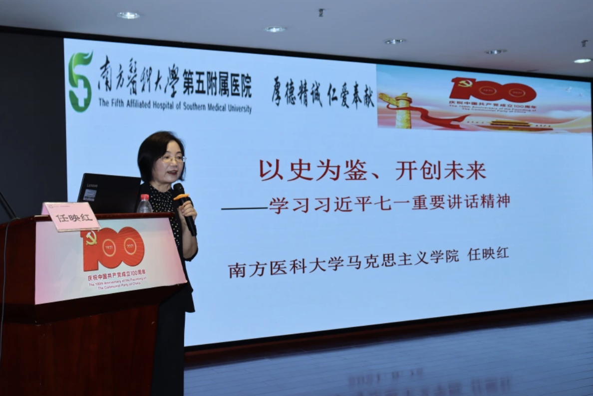会议邀请了南方医科大学马克思主义学院院长任映红教授作专题辅导。她围绕《以史为鉴、开创未来——学习习近平“七一”重要讲话精神》的主题,用生动的语言、详实的史料,从“建党之前的历史回顾、建党百年的历史主题、建党百年的成功密码”三个方面进行阐述,系统讲授了习近平总书记“七一”重要讲话精神的重大意义、丰富内涵、核心要义、实践要求。专题辅导脉络清晰,内容丰富,是一次既生动又深刻的党史教育、理论教育,对学习领会、贯彻落实习近平总书记“七一”重要讲话精神具有重要的指导意义和促进作用。