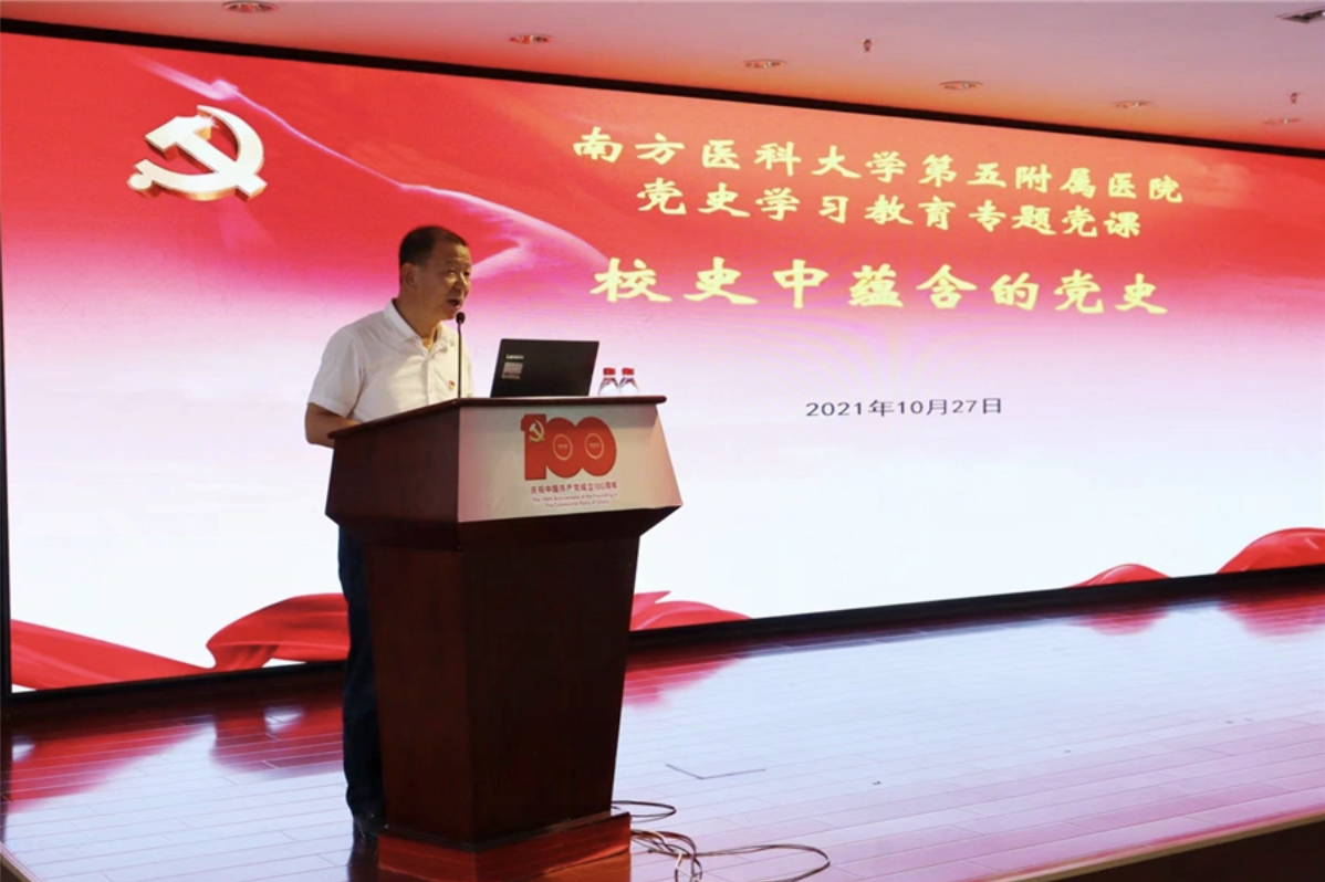 10月27日下午,在南方医科大学建校70周年之际,南医五院党委组织党史学习教育专题党课,学习校史中蕴含的党史,大学通识教育部主任严金海教授讲授了一堂精彩的党史和传奇的校史课。全院各党支部书记,部门、科室相关负责人及骨干参加学习。