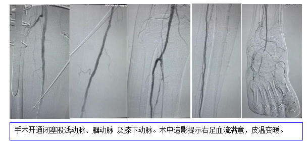 近日,杨先生因为右脚持续疼痛来到南方医科大学第五附属医院介入血管外科就诊,就诊时右足冰凉,脚趾皮肤发生破溃。CTA提示股浅动脉中远段、腘动脉及膝下动脉闭塞。患者接受血管腔内微创手术,医生通过血管成型手术开通多处闭塞血管,恢复右脚血供。右足血供恢复后皮温变暖,疼痛也就逐渐解除了。南五介入血管外科邓保平主任提醒,下肢动脉硬化患者出现下肢疼痛,需要及时到医院就诊,养成良好的生活习惯,戒烟非常重要,控制好血糖、血压、血脂这些危险因素。