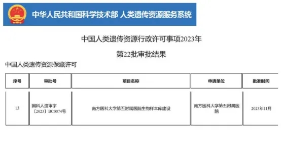 近日,国家科技部公布中国人类遗传资源行政许可事项2023年第22批审批结果,全国共13家单位获批,南方医科大学第五附属医院光荣在列。是广州市从化区首家获批资格的医疗单位,也是南方医科大学体系内第三家官方授权单位。