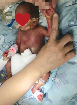 32岁的阿芳在孕24+5周(24周又5天)因胎膜早破入院保胎,2周后突发情况,分娩在即十万火急。新生儿科黄维本主任组织具有丰富复苏抢救经验的李清河医生及护士团队赶往产房抢救,阿芳顺产分娩。因孕周只有26+5周,豆豆(婴儿乳名)出生体重只有1000克,属于极低体重的超早产儿。