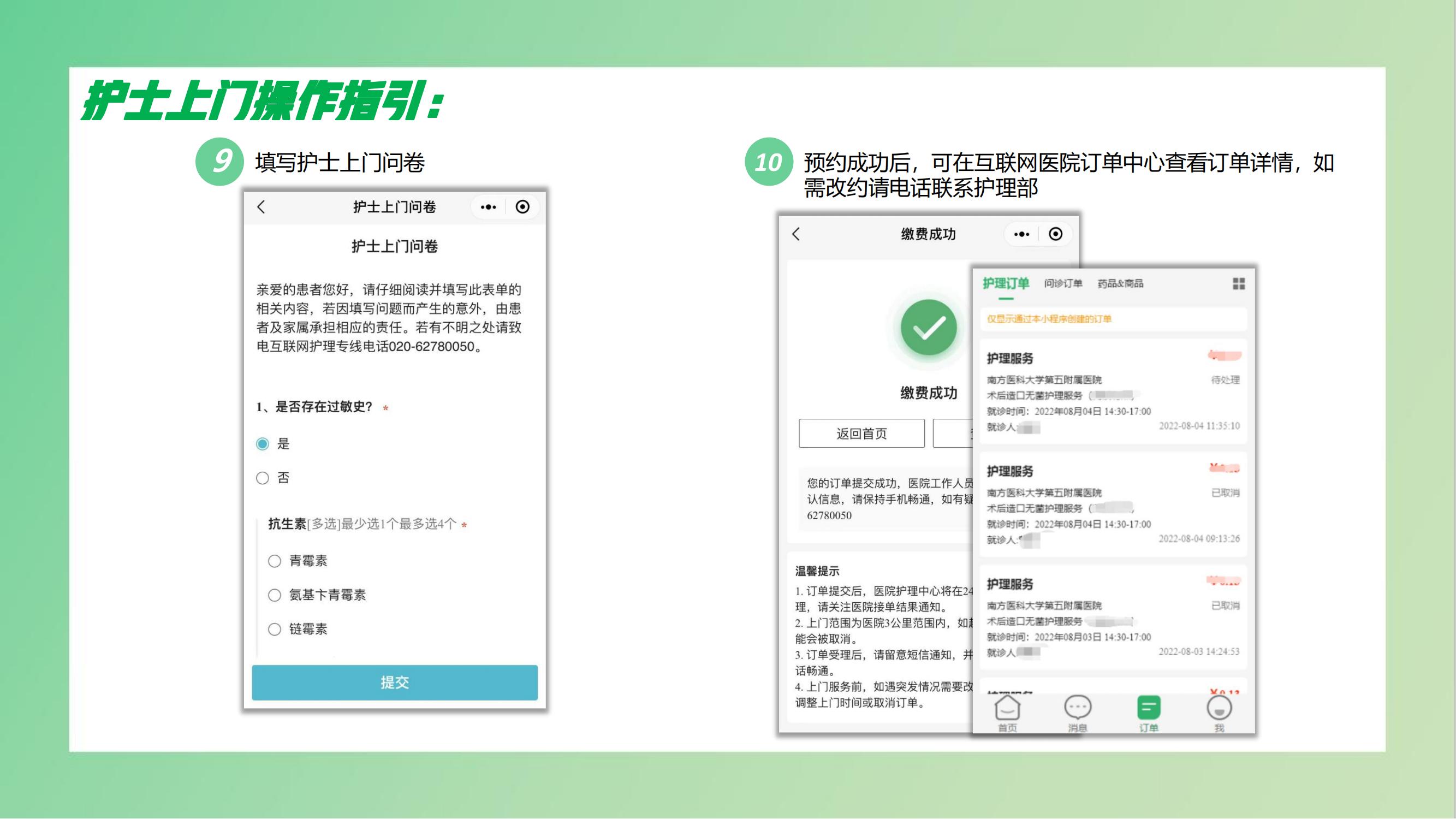 南方医科大学第五附属医院制定了相应的操作流程与服务规范,以达到“线上线下,同质管理”的要求,保证“互联网+护理服务”的规范开展,保障护患双方的合法权益,希望患者在家就能够享受到专科护理带来的方便和快捷。