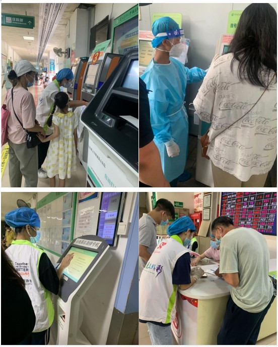 活动第二天开始,营员们进行了连续三天的志愿服务,他们分别前往门诊大厅、核酸采集点、体检中心等志愿服务点,为患者提供导医导诊、协助使用自助设备、查看健康码等服务。志愿服务虽然辛苦,但是营员们依旧不惧高温和雨天,坚守岗位,热情为患者解难题。