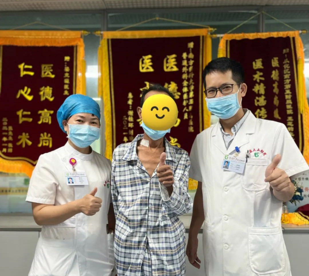 得知情况后,王芝钧主任、蔡珍玲护士长及主管医生、主管护师耐心劝导,认真为李叔做思想工作,向他讲述大家如何将他从死亡的边缘抢救回来的。慢慢地,李叔心情逐渐平静下来,开始积极配合治疗。王芝钧主任时刻关注患者病情变化,每天带领医护团队查看患者恢复情况,疏导患者情绪。经过医护团队的精心救治,术后第5天患者可以下床活动,术后消化道造影及彩超显示术后恢复良好,身上的引流管也慢慢减少,并于近日顺利出院。