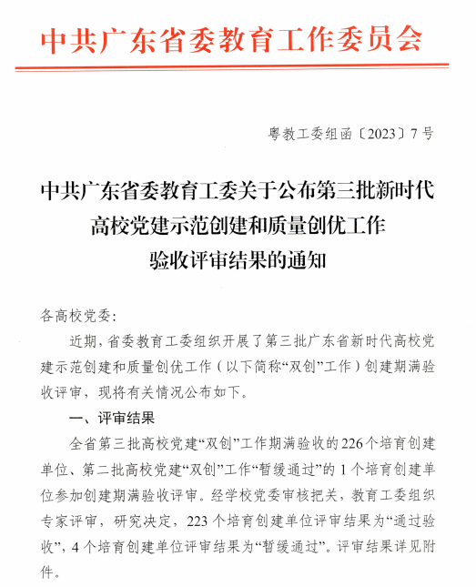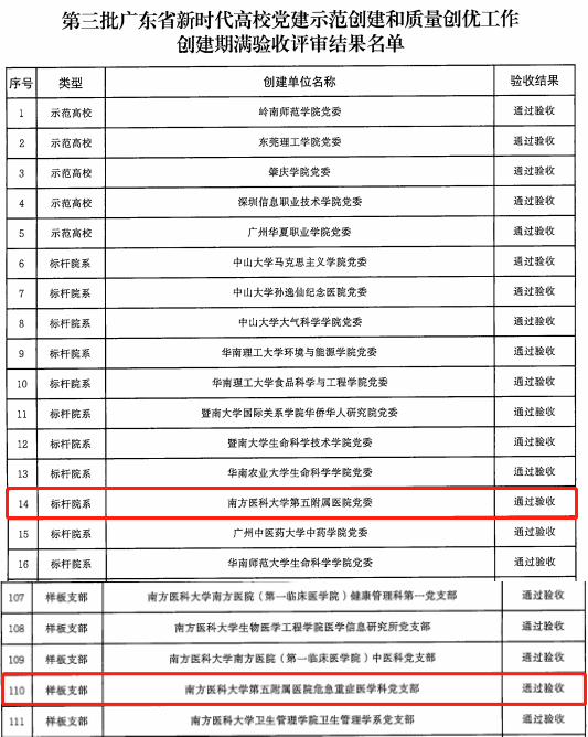 近日,广东省委教育工委发文公布第三批新时代高校党建“双创”验收评审结果。南方医科大学第五附属医院党委通过“标杆院系”验收、危急重症医学科党支部通过“样板支部”验收。