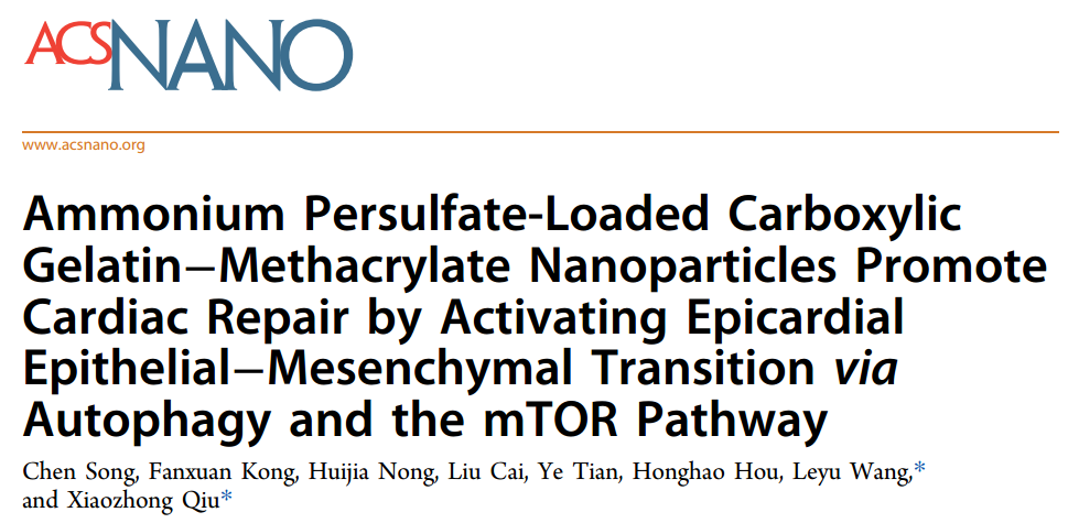 近日,第五附属医院邱小忠教授及团队在《ACSNano》(一区)上在线发表了题为“AmmoniumPersulfate-LoadedCarboxylicGelatin−MethacrylateNanoparticlesPromoteCardiacRepairbyActivatingEpicardia...